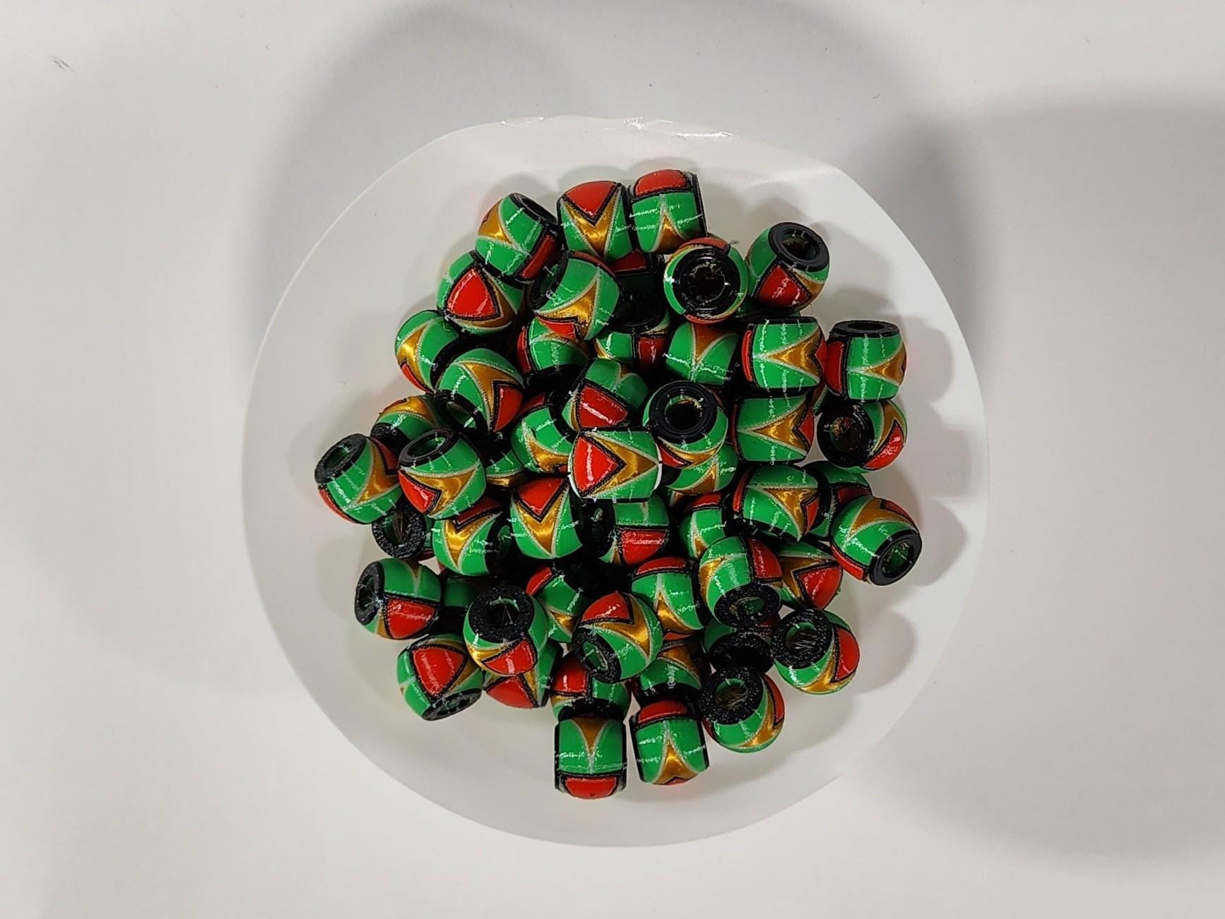 These are barrel style beads inspired the Guyanese flag. They are printed solidly in colors as shown, so they are not painted and any wear over time won't show different than what you see! The beads are also dual sided as the flag wraps around each side, and are wide enough for quite a few hair or braid types.